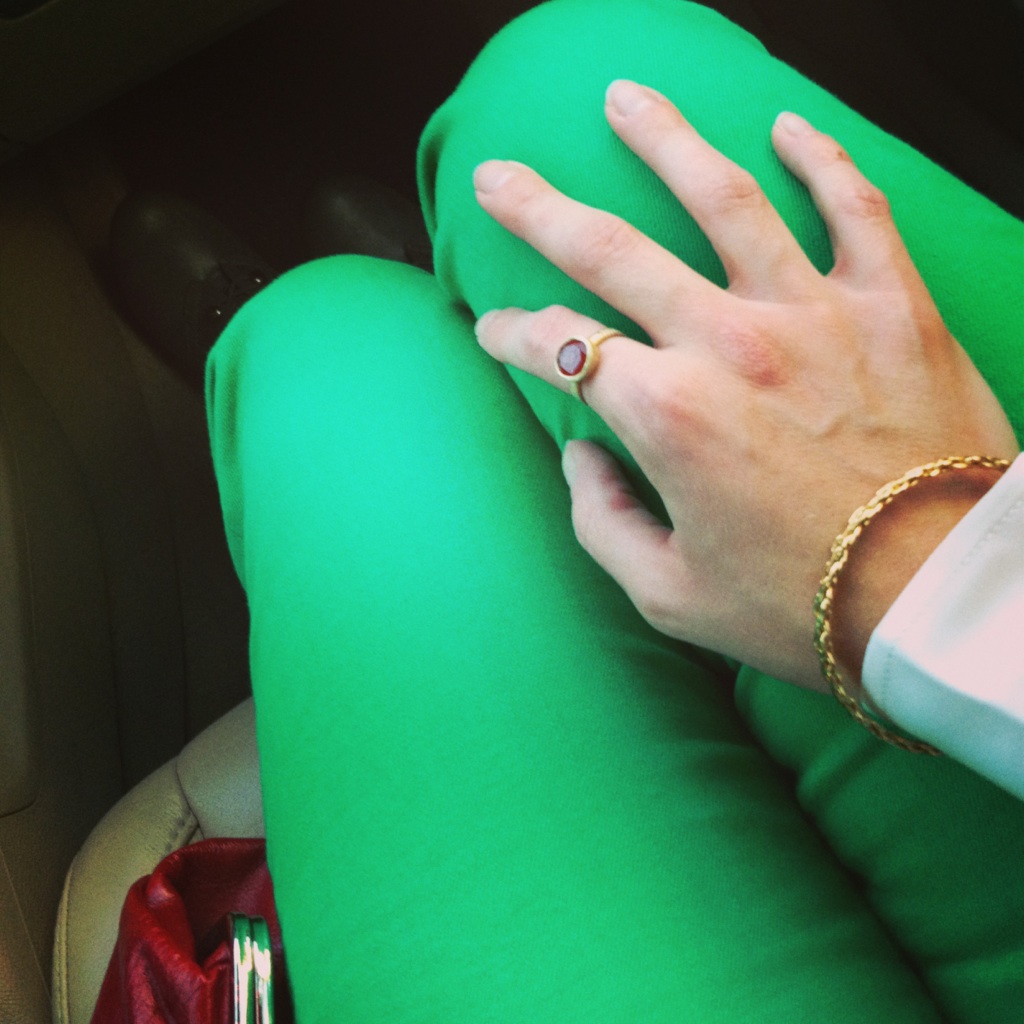 For your wardrobe, snag a great pair of emerald bottoms (JCrew shown below) and balance them with a neutral top.