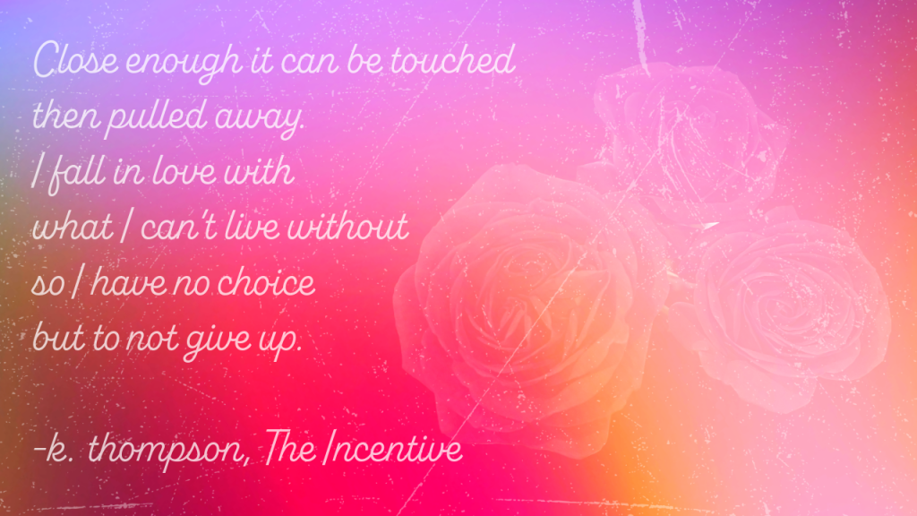 Close enough it can be touched then pulled away. I fall in love with what I can’t live without so I have no choice but to not give up.